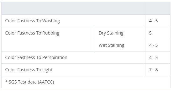 - High color fastness, dry and wet friction resistance, water washing resistance.